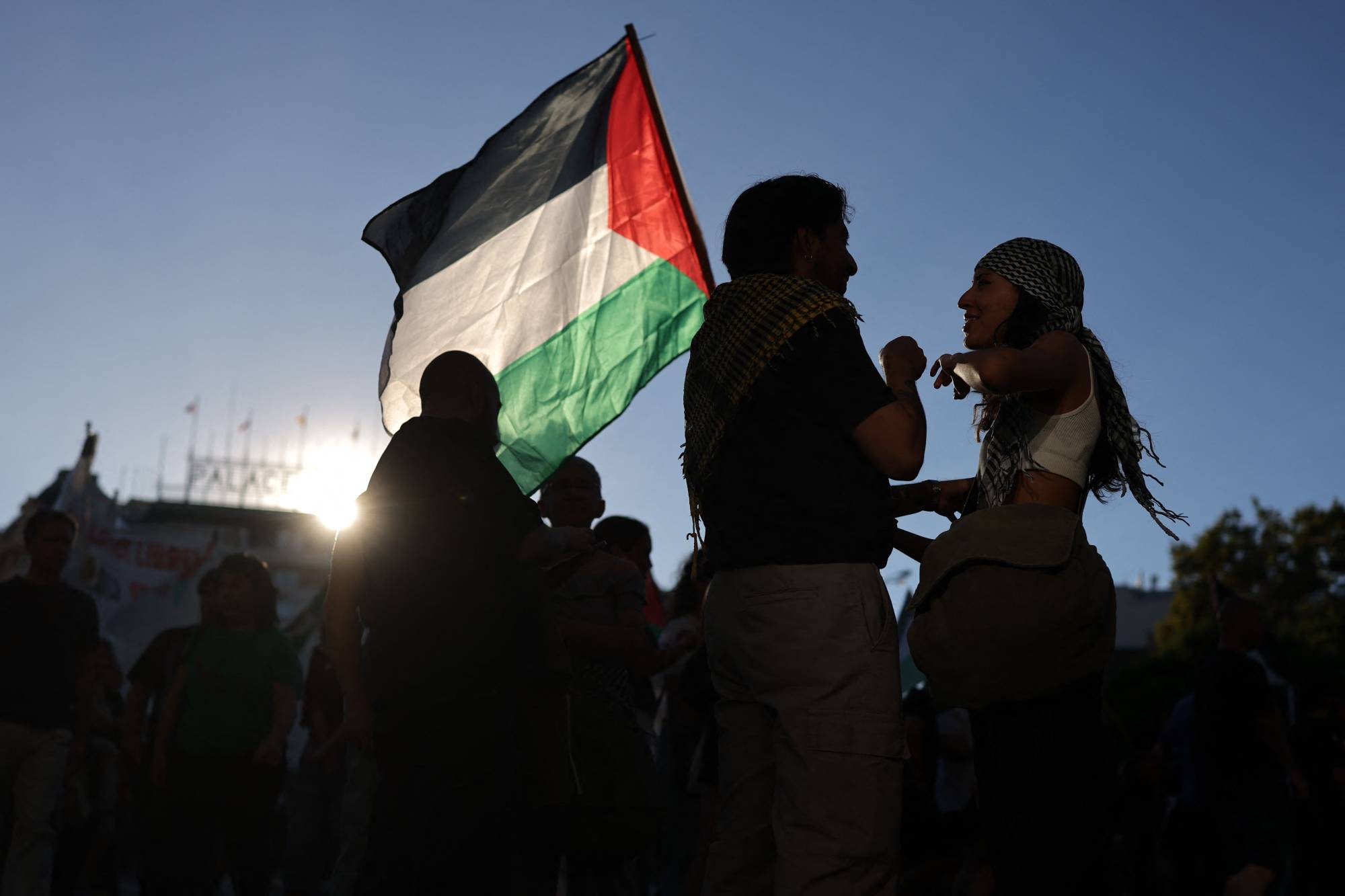 وفي لندن، تجمّع قرابة ألف شخص، السبت، في ساحة ترافلغار تضامناً مع مجموعة «فلسطين أكشن» (التحرك من أجل فلسطين) المحظورة، وفق ما أعلنت مجموعة «الدفاع عن هيئات محلّفينا»؛ الجهة المنظِّمة.