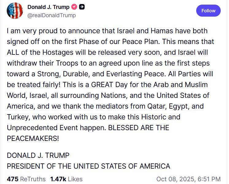 أعلن الرئيس الأميركي دونالد ترمب عبر منصة «تروث سوشيال» أن إسرائيل وحركة المقاومة الإسلامية الفلسطينية (حماس) وقعتا على المرحلة الأولى من اتفاق غزة الذي اقترحته الولايات المتحدة، والذي يسمح بالإفراج عن جميع الرهائن الإسرائيليين.