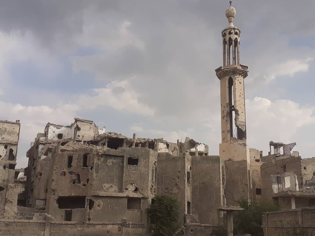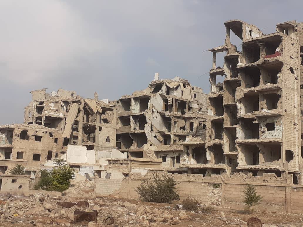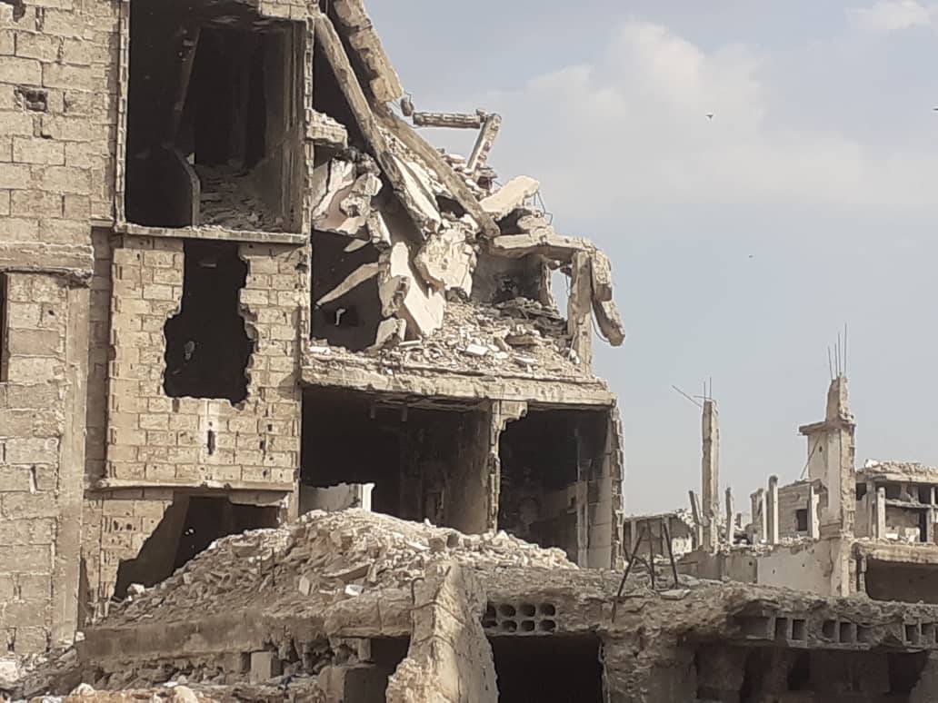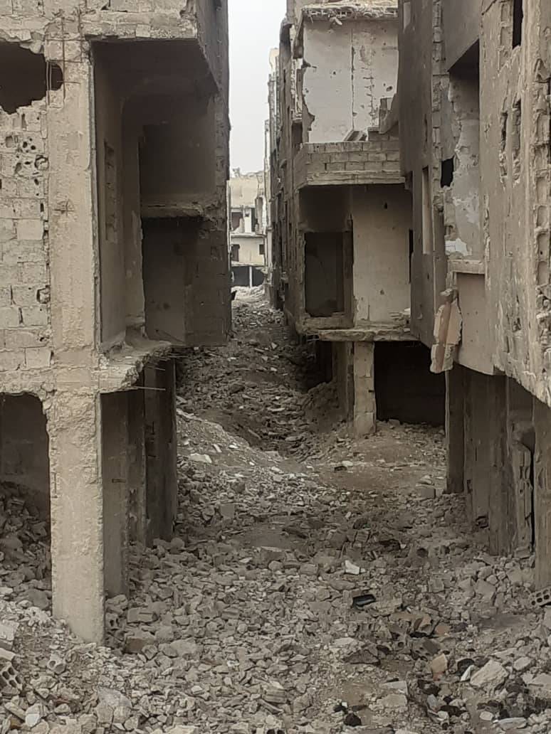 يدل المشهد على مشارف مدخل حي «الدخانية»، على أن لا حياة فيه ينتظر إعادة الإعمار بعد سنوات الحرب. طوابق علوية من أبنية دُمّر معظم جدرانها، وتدلت أجزاء من أسقفها جراء قصف عنيف تعرضت له.