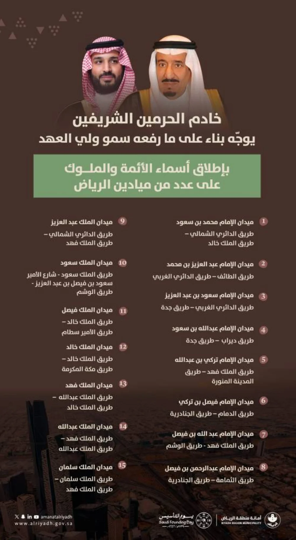 إطلاق أسماء أئمة وملوك الدولة السعودية على 15 ميدانا بمدينة الرياض