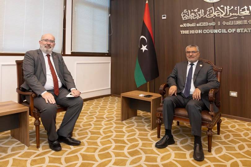 في غضون ذلك، استعرض رئيس المجلس الأعلى للدولة، محمد تكالة، خلال اجتماعه، الأربعاء، بطرابلس مع السفير البريطاني مارتن لونغدن: «مستجدات الأوضاع السياسية في البلاد، وسبل إنهاء حالة الجمود السياسي، والخروج من المراحل الانتقالية من خلال انتخابات حرة ونزيهة، تعبر عن تطلعات الشعب الليبي».