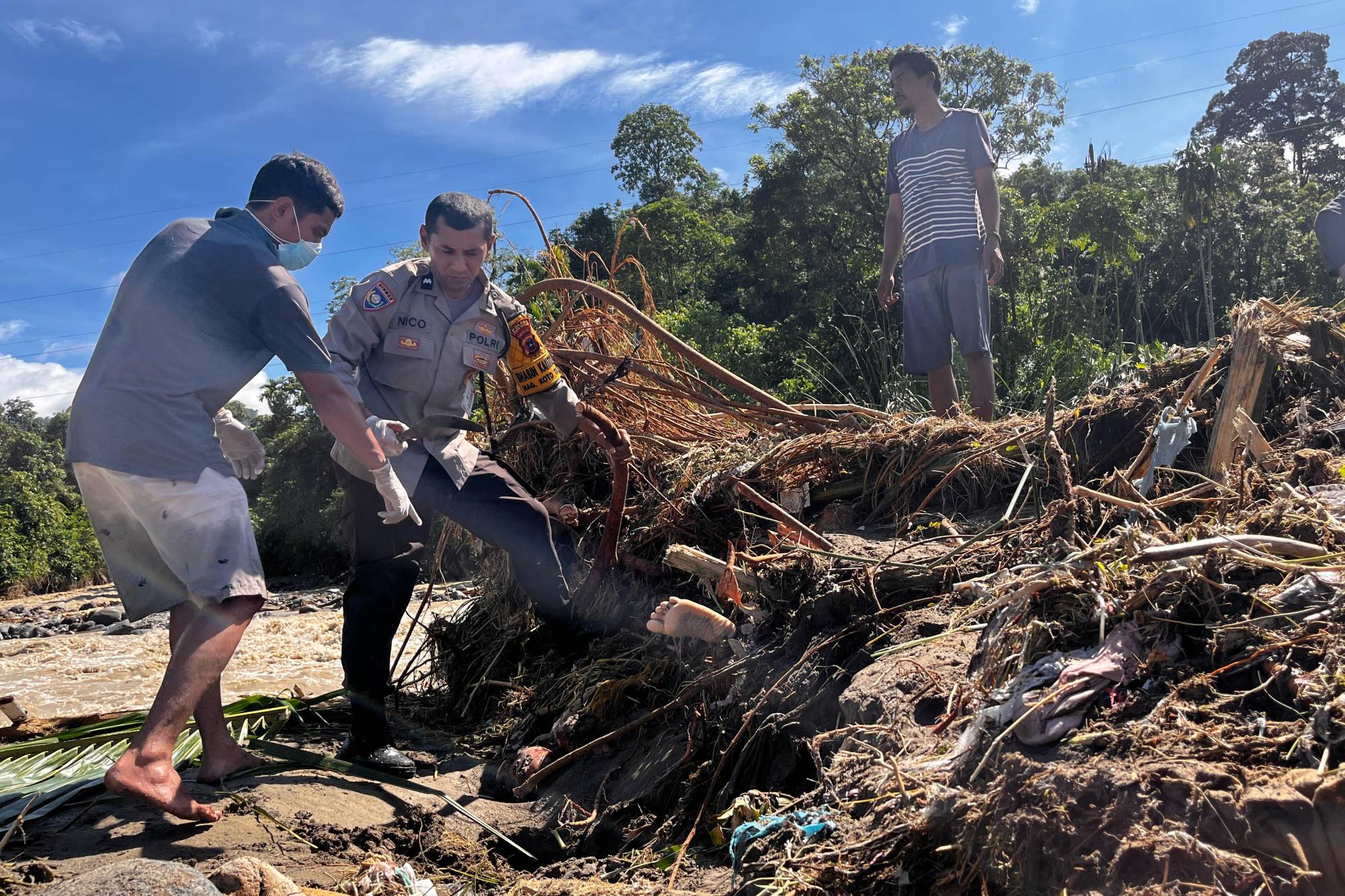 يحاول رجال الإنقاذ انتشال جثة أحد ضحايا الفيضانات من تحت الطين والحطام في بادانج باريامان غرب سومطرة (أ.ب)