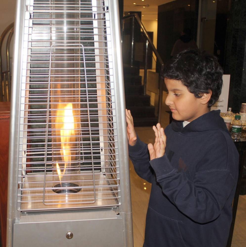 الطفل منذر العمري، يقف أمام إحدى وسائل التدفئة في مدينة تبوك التي سجلت انخفاضاً ملموساً في درجات الحرارة، ويعد شتاء تبوك الأكثر برودة حيث يتم الاستعانة بوسائل التدفئة؛ للوقاية من البرد والصقيع. (تصوير: علي بدير)