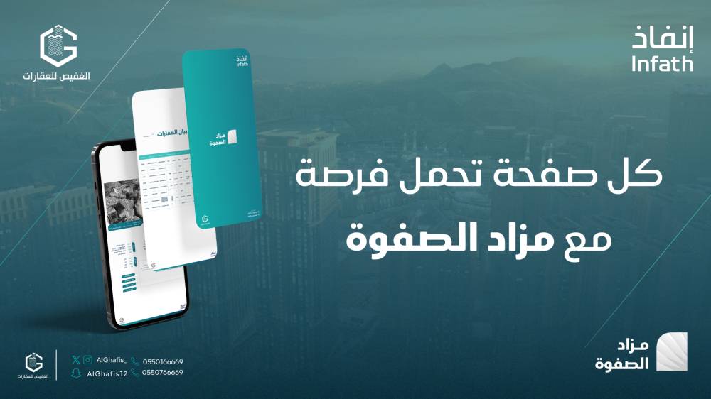 تعلن مجموعة الغفيص للعقارات، وبإشراف مركز الإسناد والتصفية إنفاذ، وبقرار من محكمة التنفيذ، عن إقامة مزاد الصفوة الإلكتروني ابتداءً من يوم السبت الموافق 16 أغسطس 2025 في تمام الساعة 10 صباحاً، انتهاءً من يوم الإثنين الموافق 18 أغسطس 2025 في تمام الساعة 6:40 مساءً، وذلك عبر منصة مباشر للمزادات.