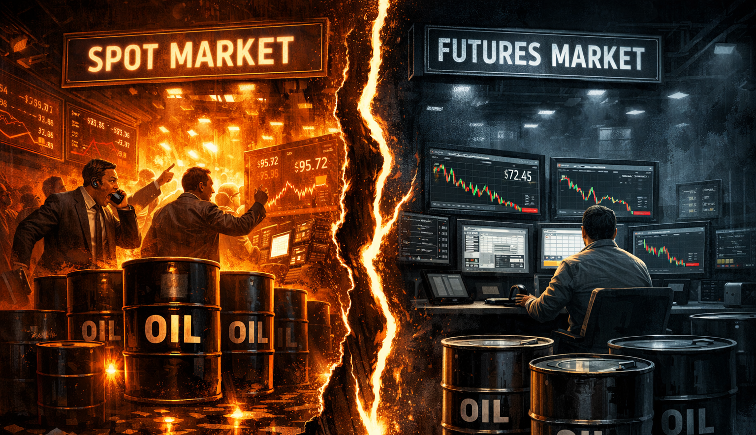 – ينظر إلى السوق الفورية باعتبارها المكان الذي تباع وتُشترى فيه البراميل فعليًا، أما سوق العقود، فتعبر عن أسعار منتجات مالية بما فيها العقود الآجلة والخيارات.