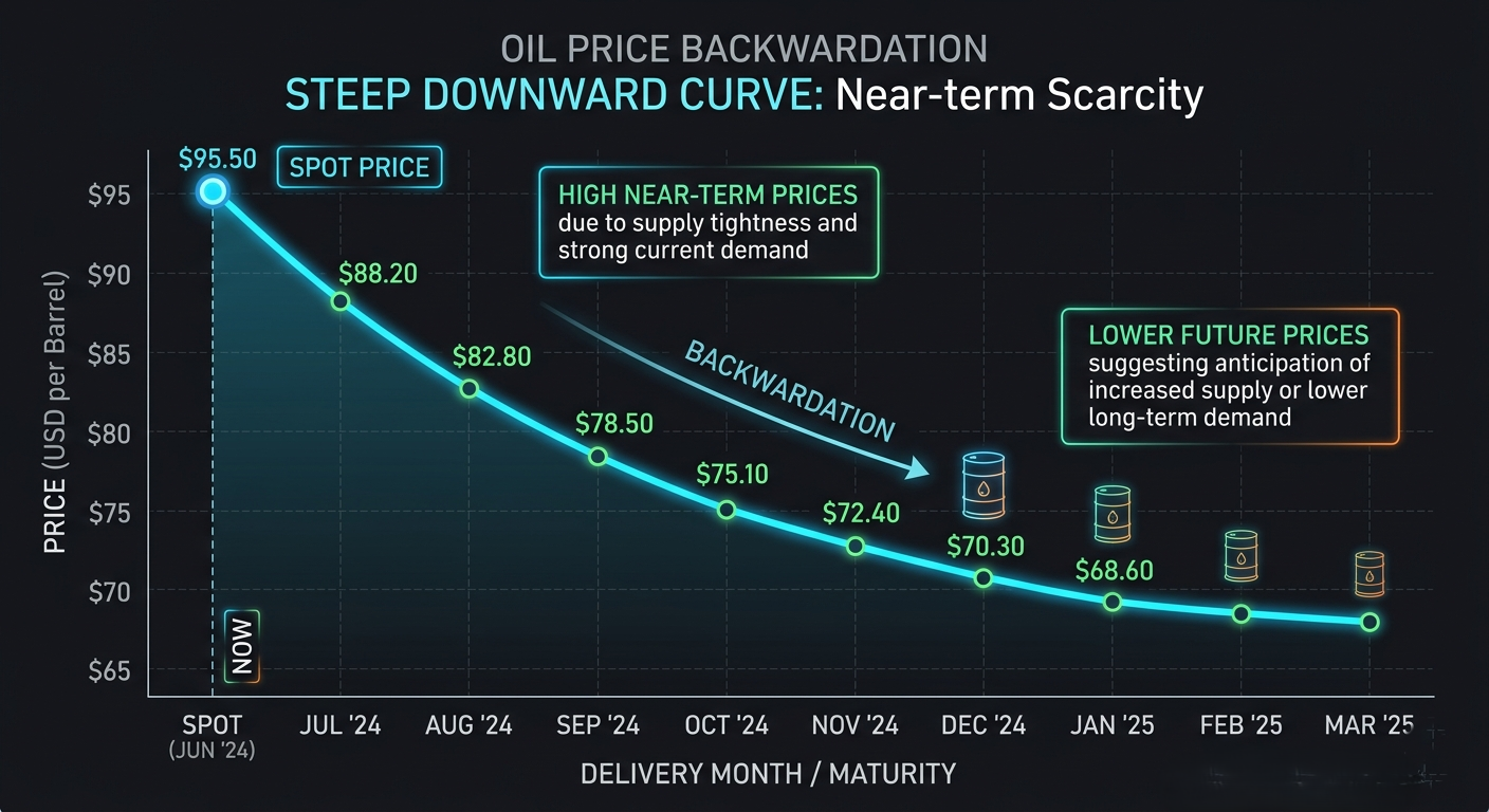 – عندما يميل المنحنى للهبوط، تكون أسعار الأشهر القريبة أعلى من أسعار المدى البعيد، وهذه الحالة التي تُسمى “الباكورديشن”، وتشير إلى أن المشترين مستعدون للدفع أكثر لتأمين الإمدادات فورًا.