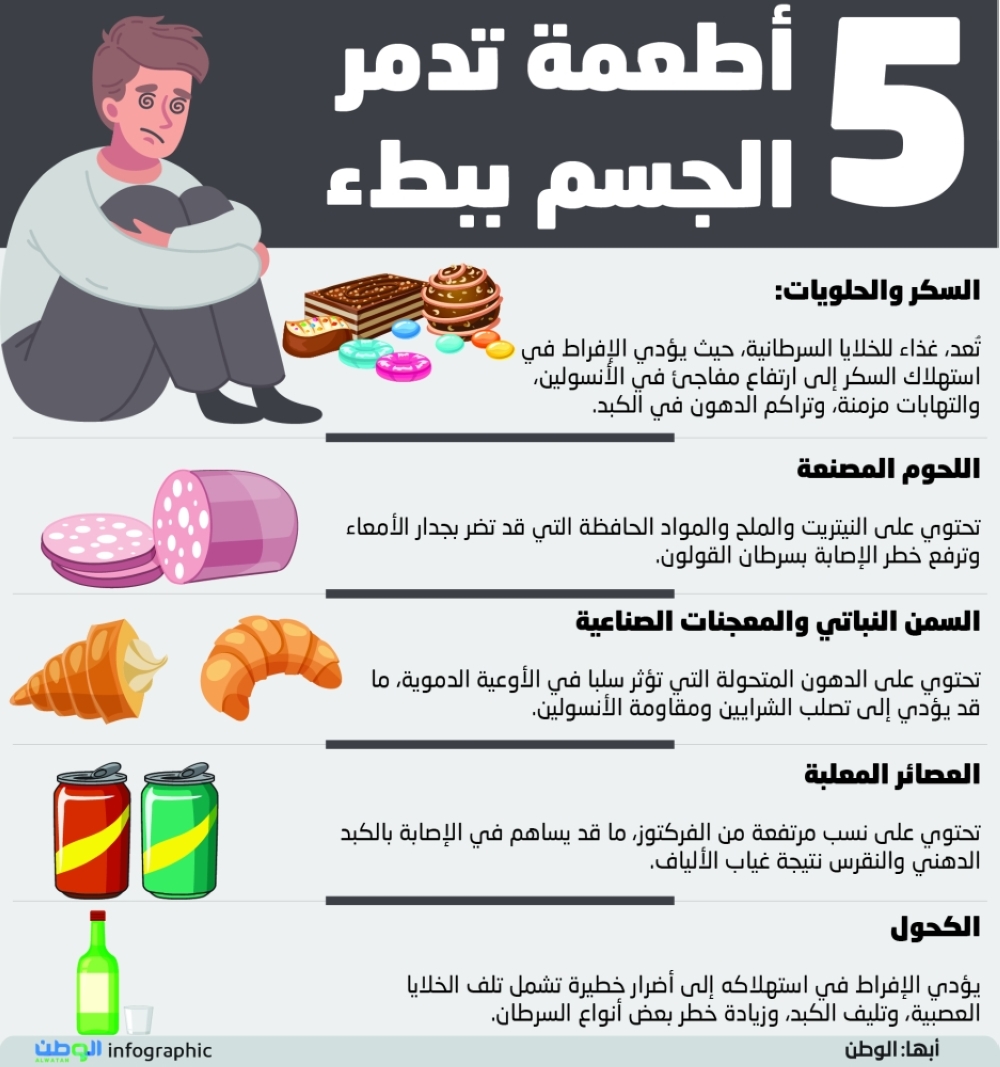 السكر والحلويات: تُعد، غذاء للخلايا السرطانية، حيث يؤدي الإفراط في استهلاك السكر إلى ارتفاع مفاجئ في الأنسولين، والتهابات مزمنة، وتراكم الدهون في الكبد.اللحوم المصنعة: تحتوي على النيتريت والملح والمواد الحافظة التي قد تضر بجدار الأمعاء وترفع خطر الإصابة بسرطان القولون.السمن النباتي والمعجنات الصناعية: تحتوي على الدهون المتحولة التي تؤثر سلبا في الأوعية الدموية، ما قد يؤدي إلى تصلب الشرايين ومقاومة الأنسولين.العصائر المعلبة: تحتوي على نسب مرتفعة من الفركتوز، ما قد يساهم في الإصابة بالكبد الدهني والنقرس نتيجة غياب الألياف.الكحول: يؤدي الإفراط في استهلاكه إلى أضرار خطيرة تشمل تلف الخلايا العصبية، وتليف الكبد، وزيادة خطر بعض أنواع السرطان.